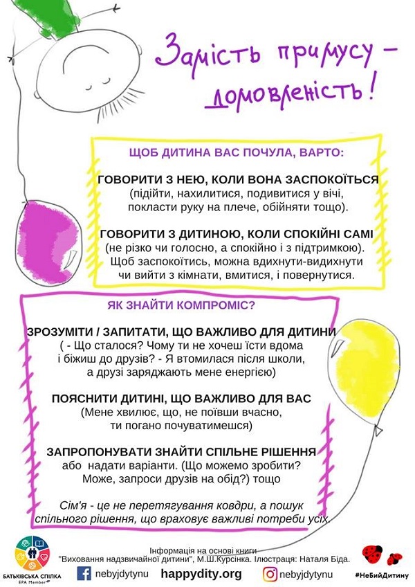 - Відверто поговоріть з дитиною про те, що відбувається, з’ясуйте мотивацію її поведінки;