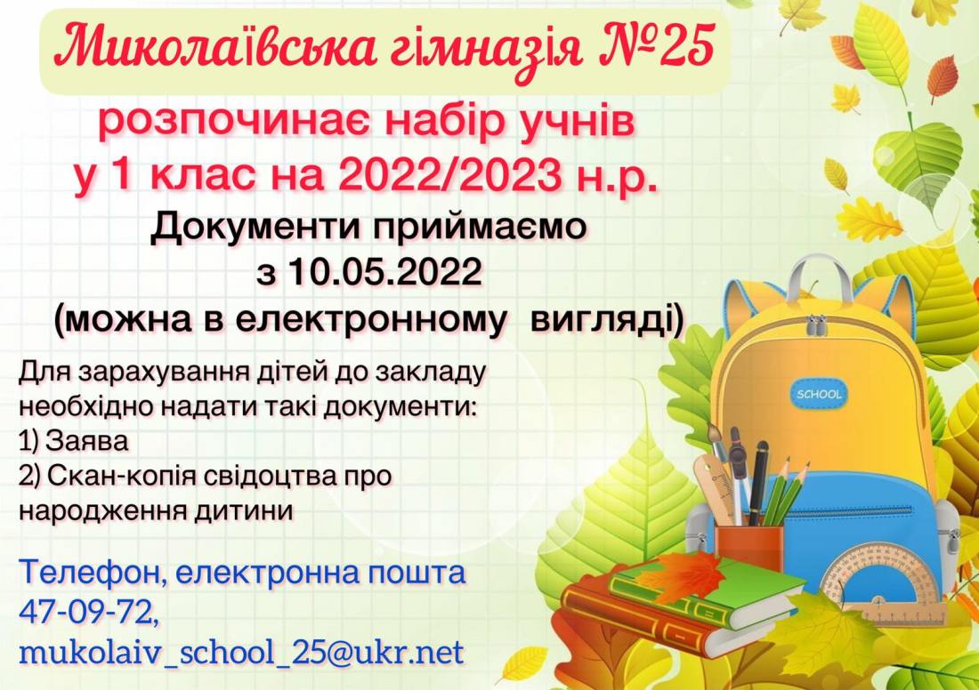 Відповідно до наказу Управління освіти Миколаївської міської ради № 73 від 01.04.2022 р. визначається дата прийому заяв про зарахування до 1 класу з 10 травня 2022 року.