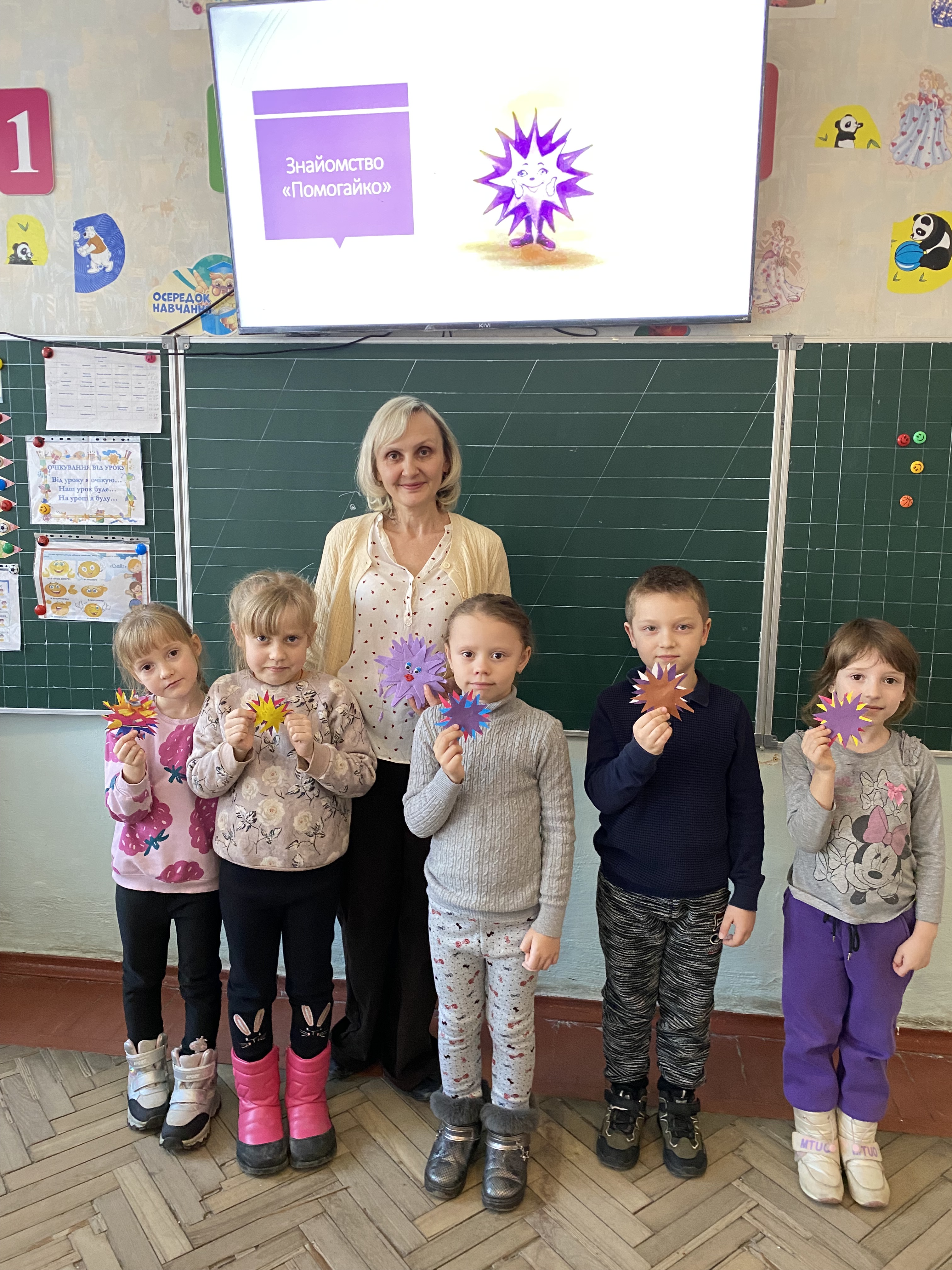 На занятті діти знайомилися з новим другом, Помагайко. Міркували та раділи разом з ним. Також майбутні учні зробили свої тришарові Помагайки, щоб мати «особистого помічника» та «маленького друга».