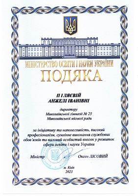 Щиро вітаємо директорку гімназії Піляєву Анжелу Іванівну з нагоди відзначення нагородою Міністерства освіти і науки України. Бажаємо незгасимого оптимізму, творчої наснаги, вагомих досягнень у здійсненні задуманого та нових здобутків у педагогічній діяльності!